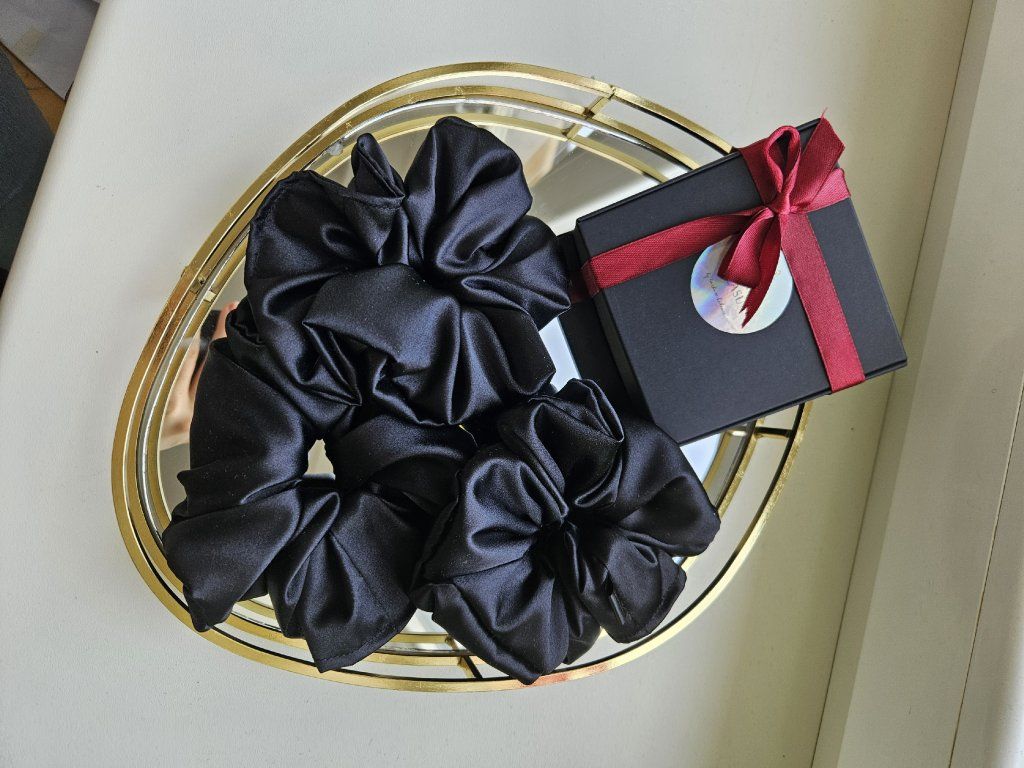 Nadčasová černá scrunchie působí elegantně a lehce tajemně. I když je nenápadná, dodá každému účesu sofistikovaný nádech. Hladký satén je šetrný k vlasům a zajišťuje pohodlné nošení po celý den.